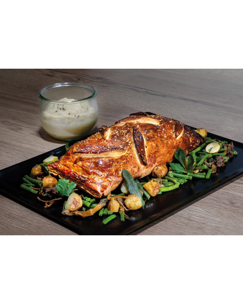 Bœuf Wellington traditionnel, accompagné d’une purée de pommes de terre à la truffe et d’une poêlée de légumes verts, le tout nappé de son jus de viande riche et savoureux.