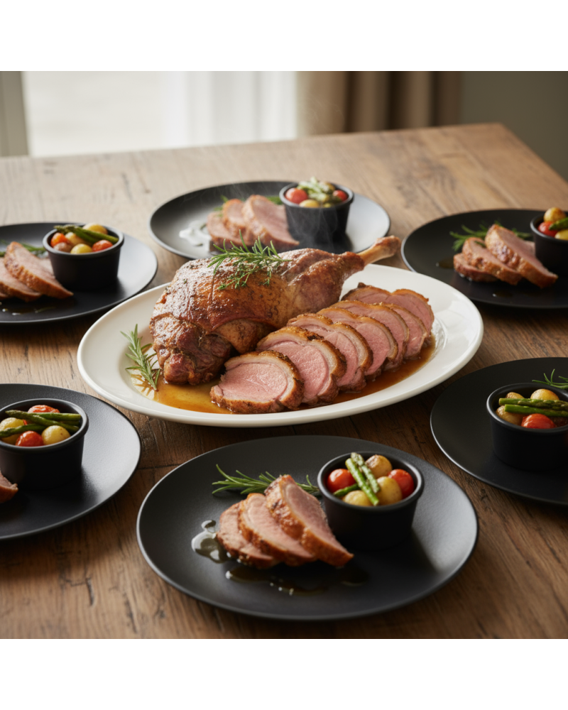 Gigot d’agneau pour 6 personnes, rôti à la perfection et parfumé aux herbes, pour un plat généreux et savoureux à partager.