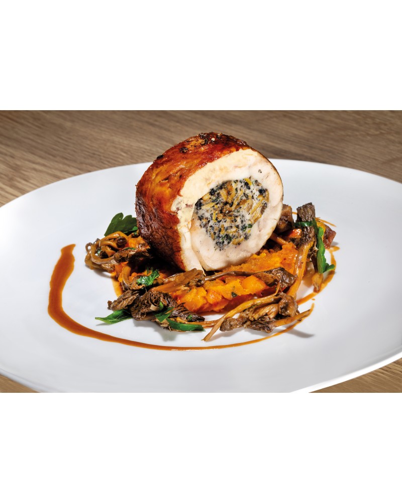 Chapon roulé farci aux cèpes, accompagné d’un écrasé de potimarron onctueux et d’une poêlée de champignons savoureuse, pour un plat riche en saveurs automnales.