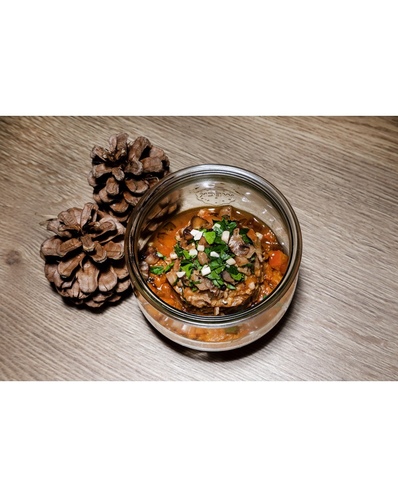 Ce plat est dressé par nos chefs dans un bocal en verre.